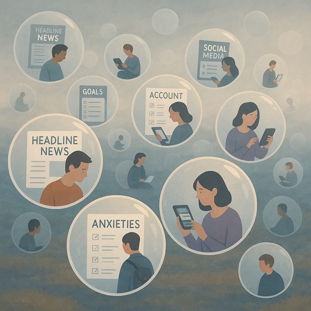 Imagine a landscape full of hundreds of “bubbles,” each containing a different person. Inside each bubble, the person’s environment consists of: headlines tailored to them, favorite social media feeds, personal goals, self-improvement plans, and anxieties.