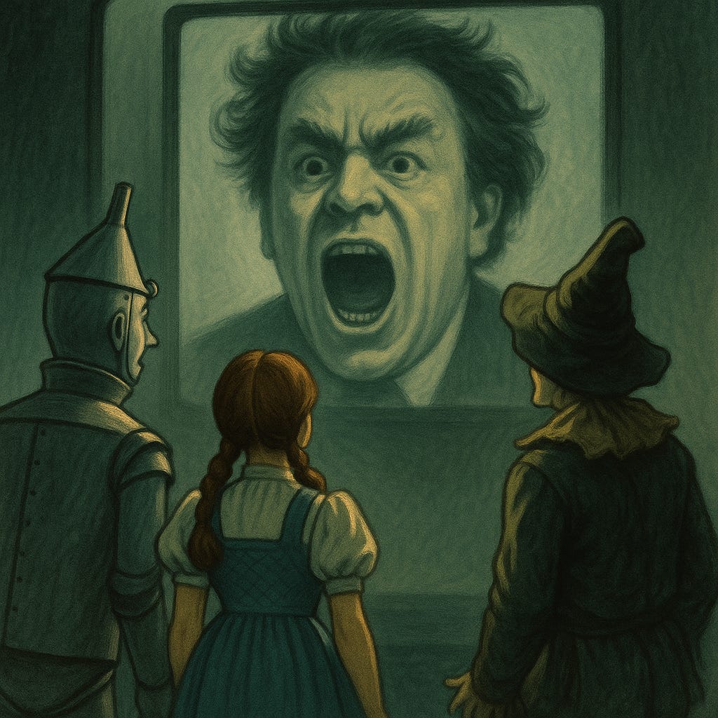 What we face on these platforms is a legitimacy crisis, similar to the one Dorothy faced in the 1939 movie The Wizard of Oz, when her tiny dog, Toto, pulls back the curtain concealing a man pulling levers on a machine next to the distorted, fiery image of a larger than life human face towering above them, projecting the booming voice of a supposed great and powerful wizard.